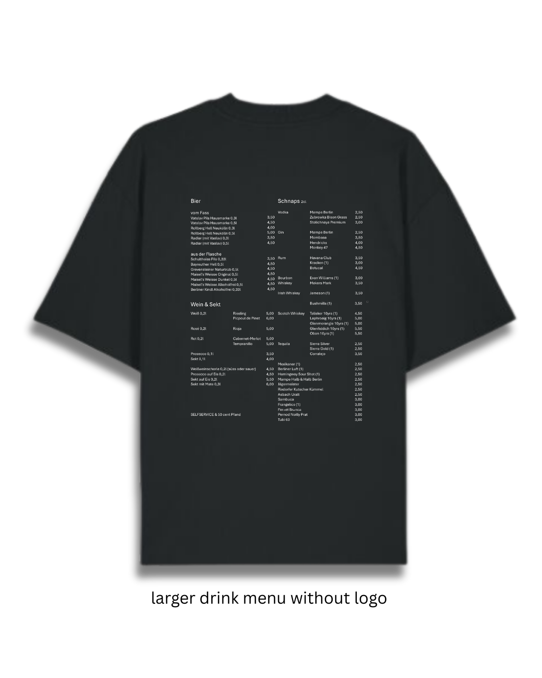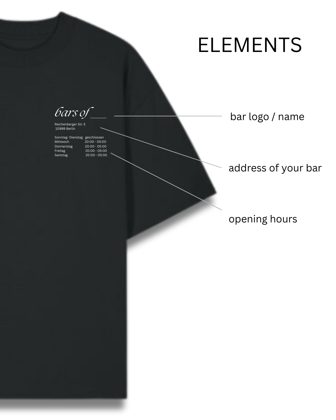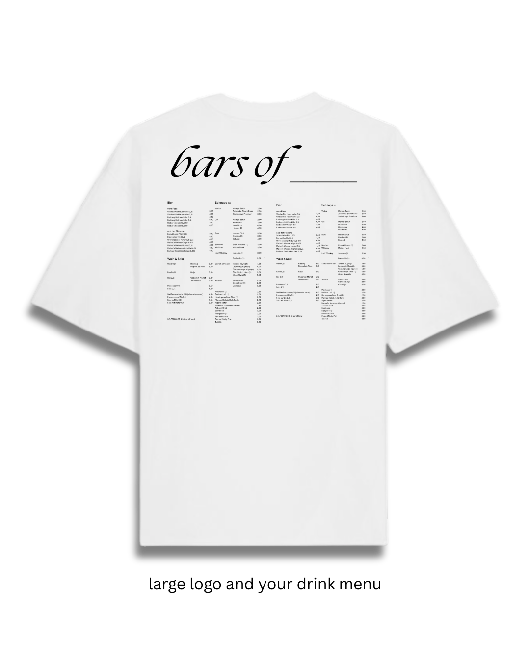 Anything can inspire the designs of your future merch collaborations with us and backprints are not necessariy, but we like them so here are a few ideas: Be it your unique menu, the drink that your guests cannot get enough from, the floorplan that anyone would recognize or anything else that contains the identity of your bar.